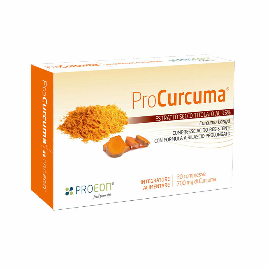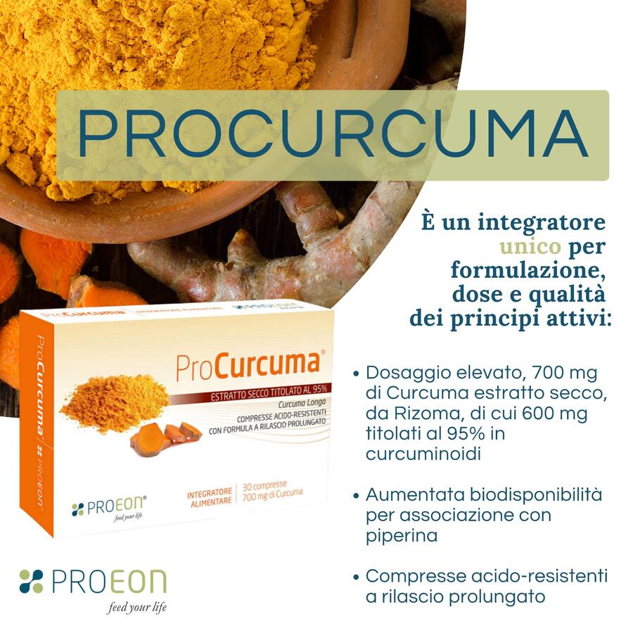 Procurcuma® è un integratore alimentare con effetto antiossidante e antinfiammatorio che contiene curcuma estratta da rizoma ad elevato dosaggio e titolata al 95% in curcuminoidi. L’associazione con piperina ne incrementa la biodisponibilità; le compresse, inoltre, presentano una filmatura esterna che le rende acido-resistenti e a rilascio prolungato. Procurcuma è un integratore unico per composizione, dose e qualità.